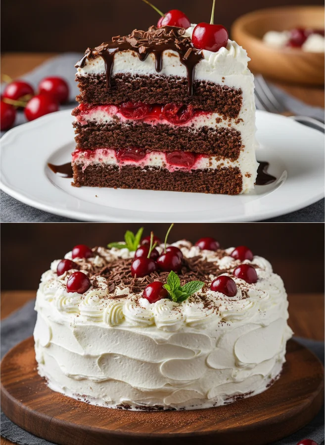 Schichten Sie den Kuchen mit Schichten aus Schlagsahne und Kirschfüllung, und bestreichen Sie ihn mit der restlichen Schlagsahne.