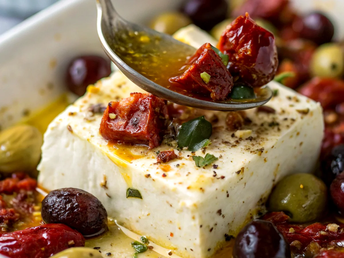 - Main ingredients: Feta cheese, olives, sun-dried tomatoes, olive oil, herbs