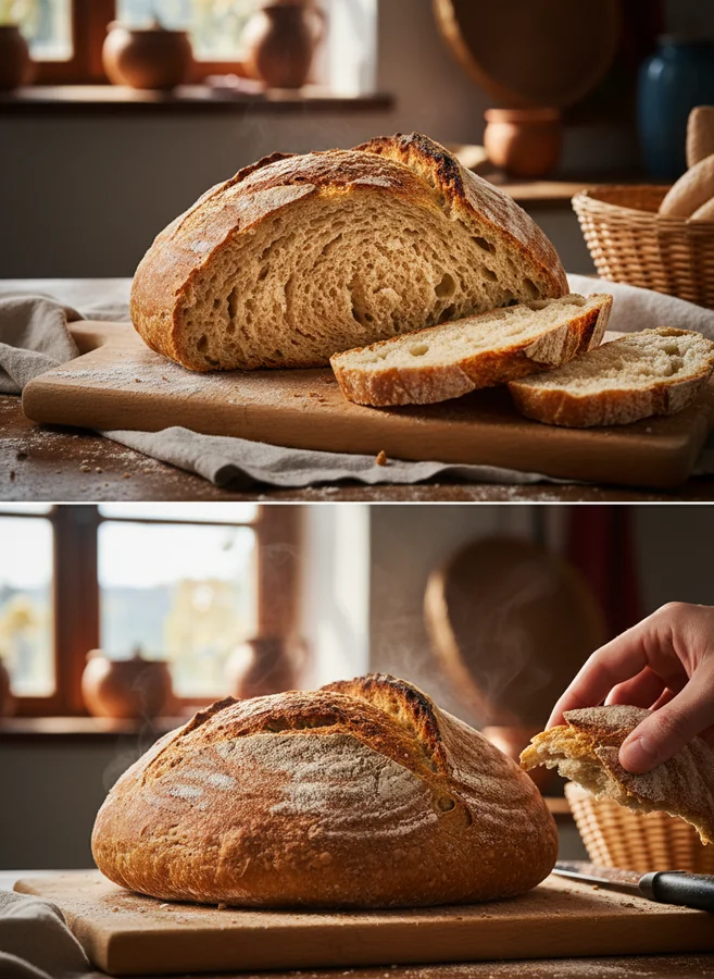 7. Backen: Heizen Sie den Ofen auf 220 °C vor. Schneiden Sie die Oberseite des Teigs ein und backen Sie ihn für 25-30 Minuten, bis er goldbraun ist und beim Klopfen auf den Boden hohl klingt.