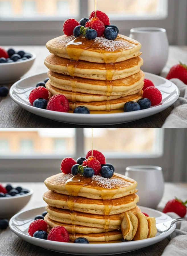 Warm servieren mit Ahornsirup, frischen Früchten und optional Puderzucker oder Schlagsahne.