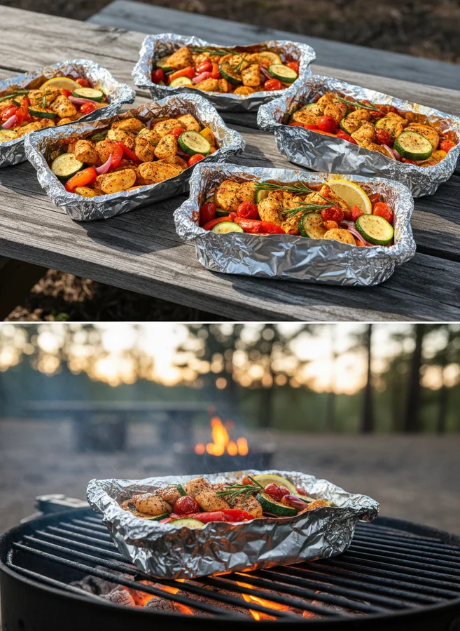 Kochen Sie die Päckchen über einem Lagerfeuer oder einem Campingkocher für 15-20 Minuten und wenden Sie sie gelegentlich.