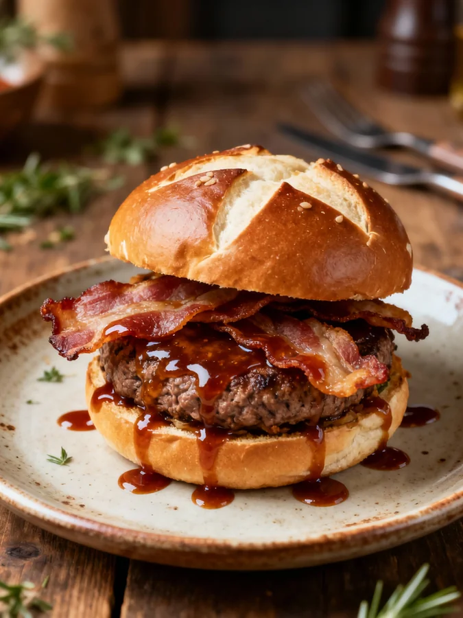 Smoky Lager-Infused Pretzel Bacon Burger Indulge in a culinary adventure with the Smoky Lager-Infused Pretzel Bacon Burger, a mouthwatering creation that combines the deep flavors of smoky lager, the satisfying