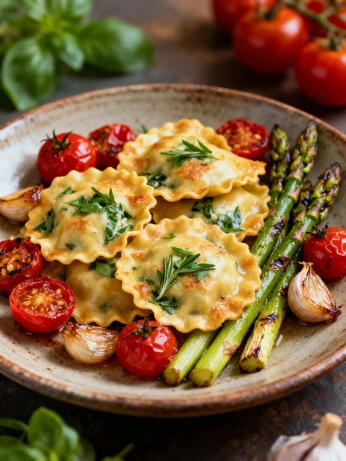 Introdução: Ravioli com tomates, aspargos, alho e ervas é uma receita que traz a frescura dos ingredientes da primavera para a sua mesa, combinando a suavidade da massa recheada com