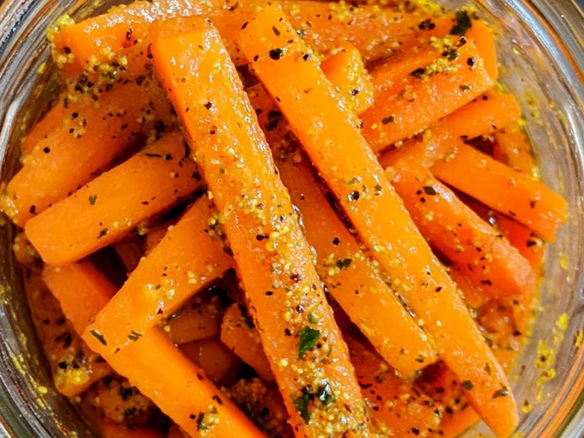 Mise en bocaux: Placez les bâtonnets de carottes dans un bocal propre et stérilisé. Versez la marinade chaude sur les carottes, en veillant à ce qu’elles soient complètement immergées.