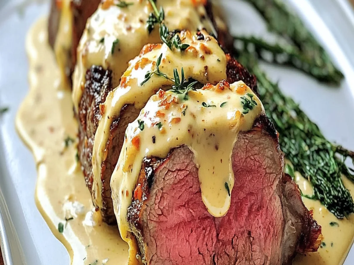 10. Serve: Slice the stuffed tenderloin into medallions and drizzle with Béarnaise sauce before serving.