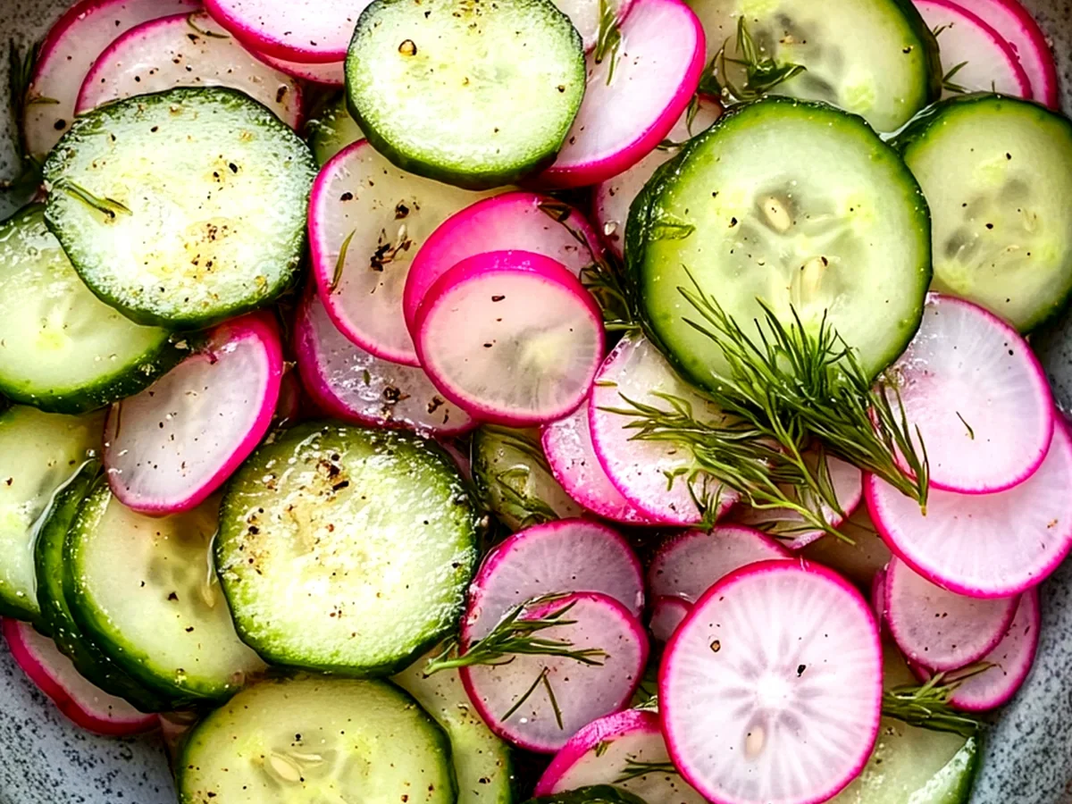 1. Prepare the vegetables: In a large bowl, combine the sliced cucumbers, radishes, and red onion. Set aside.
