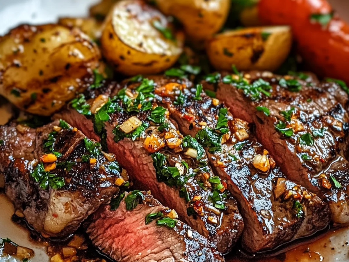 6. Slice and Serve: After resting, slice the steak against the grain into thin strips. Drizzle the warm garlic butter over the sliced steak before serving.