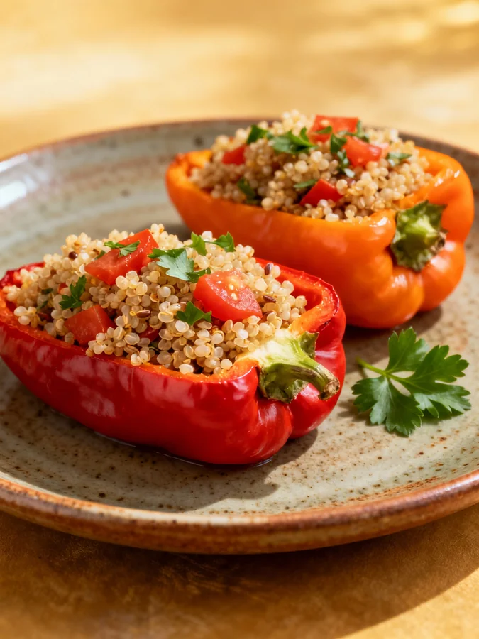- Schritt 6: Die Quinoamischung in jede Paprika löffeln und leicht andrücken. Übrige Füllung um die Paprika in der Form verteilen.