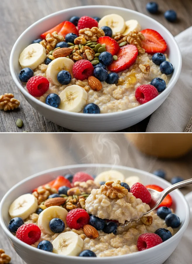 - Hauptzutaten: Haferflocken, Joghurt, Früchte, Nüsse, Samen