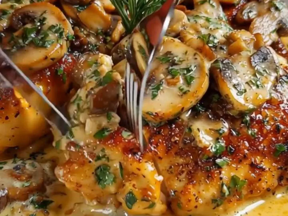 Genießen Sie Ihr köstliches hausgemachtes Hähnchen mit Knoblauch-Pilzsauce !