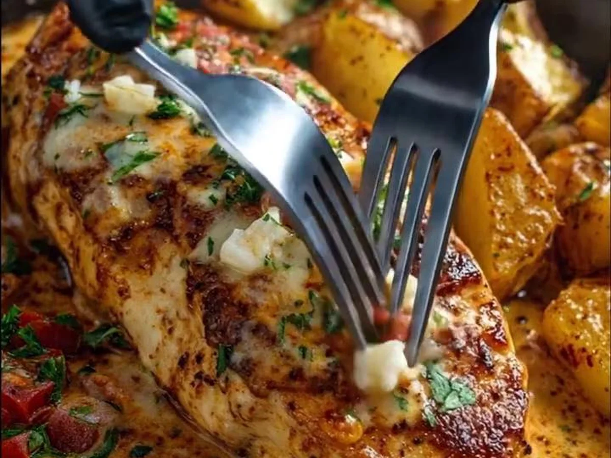 Hähnchenbrust mit Käsesauce und Röstkartoffeln