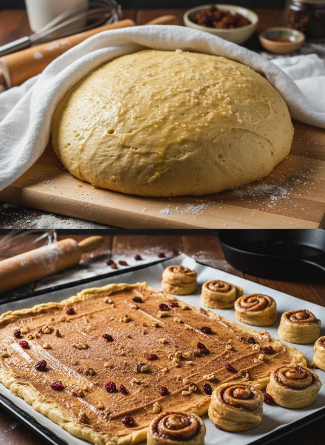 6. Formen: Den Teig auf die Arbeitsfläche geben, leicht durchkneten und in die gewünschte Form bringen, sei es für Brötchen, Zimtschnecken oder andere Leckereien. Lassen Sie ihn erneut gehen, während Sie den Ofen aufheizen.