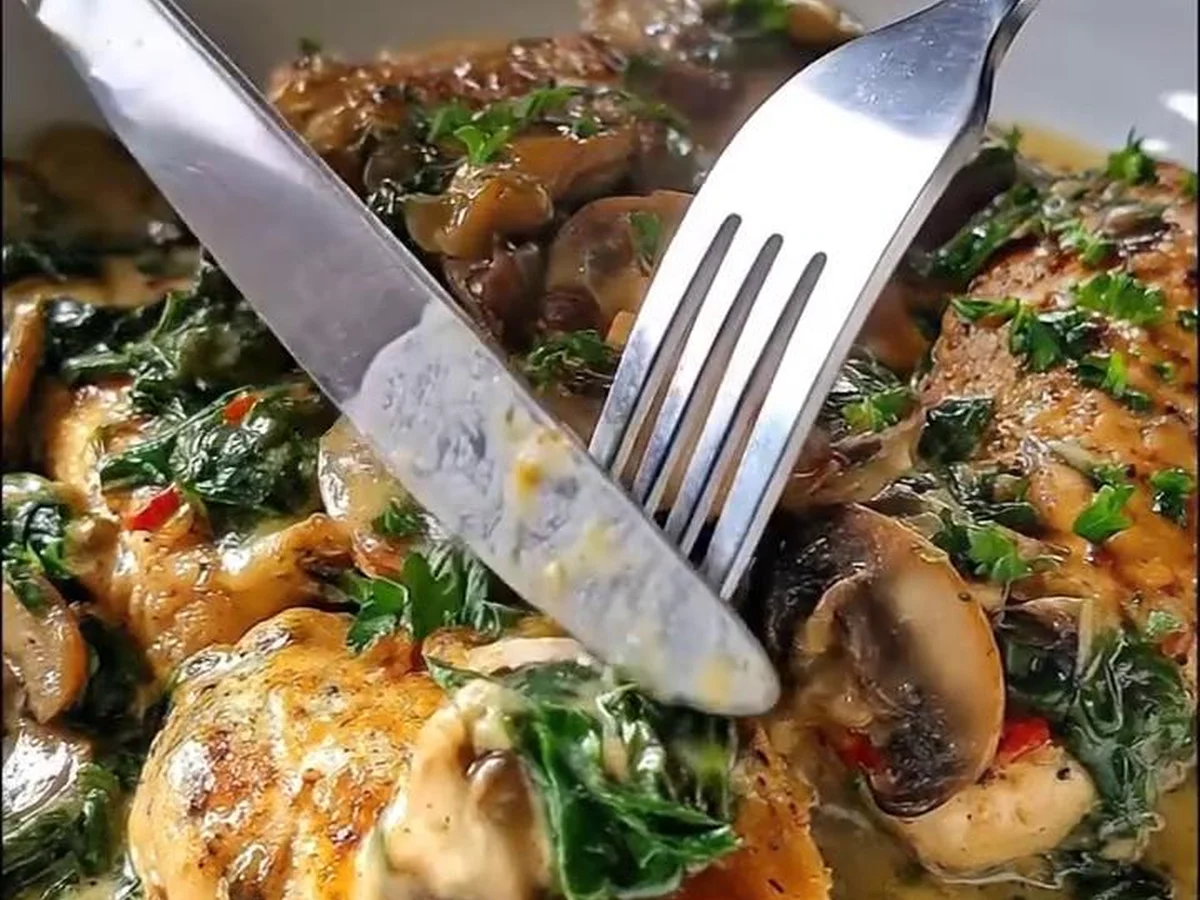 Genießen Sie Ihr köstliches hausgemachtes Hühnchen mit Spinat und Champignons !