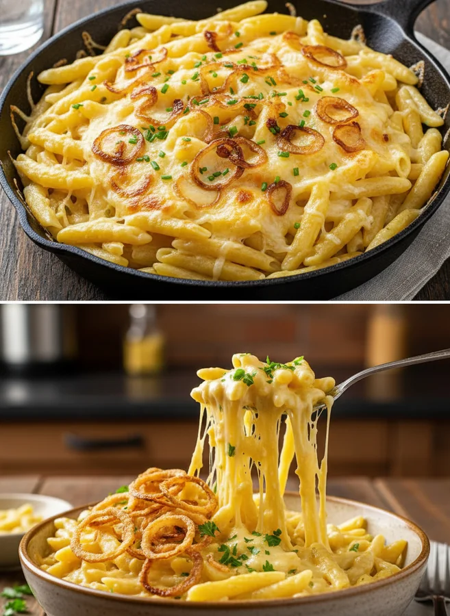 In einer Auflaufform Spätzle schichten, mit Käse und Zwiebeln abwechseln, würzen und mit Käse abschließen.