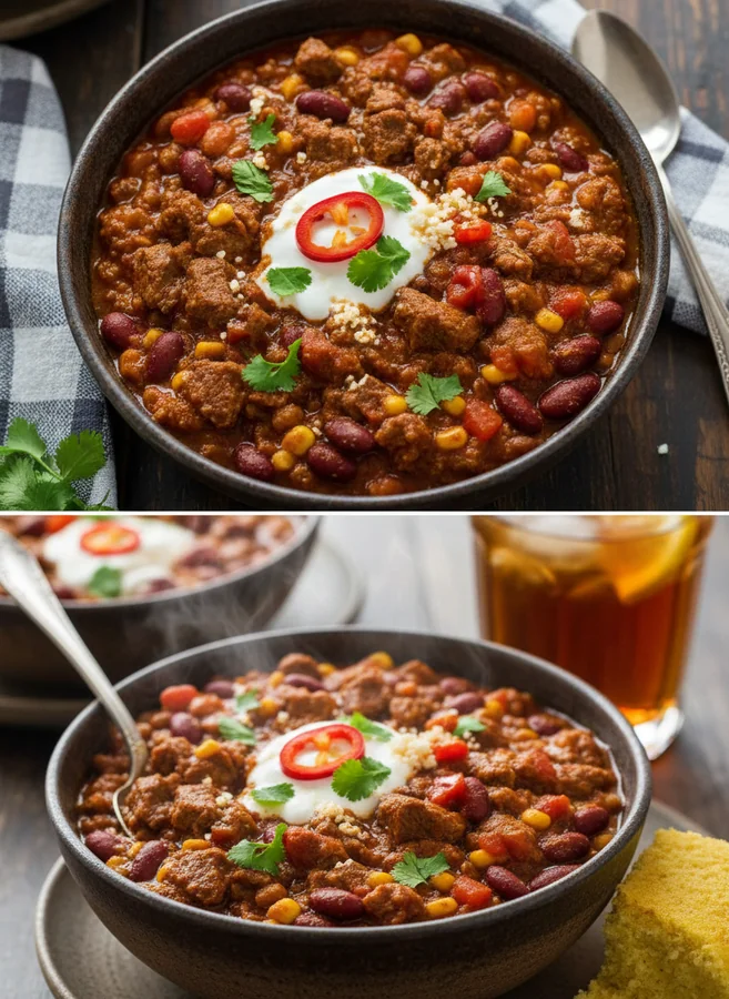 • Hauptzutaten: Rinderhackfleisch, Kidneybohnen, Tomaten, Zwiebeln, Knoblauch, Paprika, Chili-Pulver, Kreuzkümmel und Brühe.