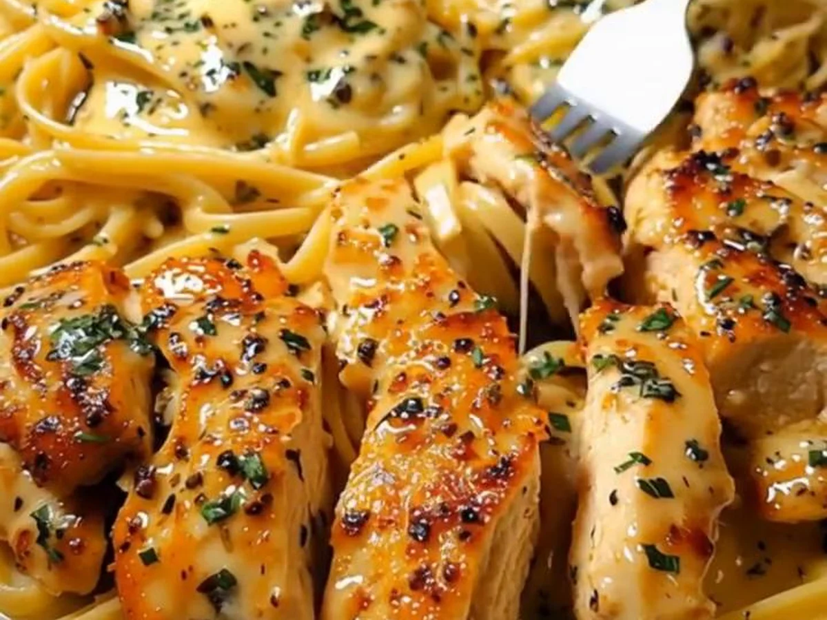 Genießen Sie Ihr köstliches hausgemachtes Knoblauch-Parmesan-Cheddar-Hähnchen-Linguine in cremiger Buttersauce !