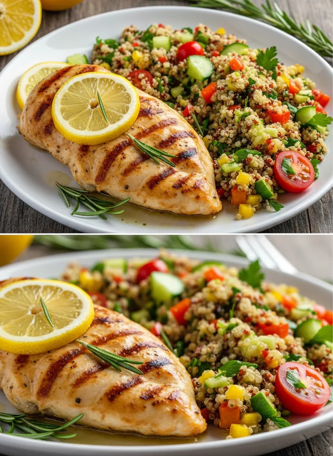 - Hauptzutaten: Quinoa, frisches Gemüse, Hühnchenbrust, Olivenöl, Zitronensaft