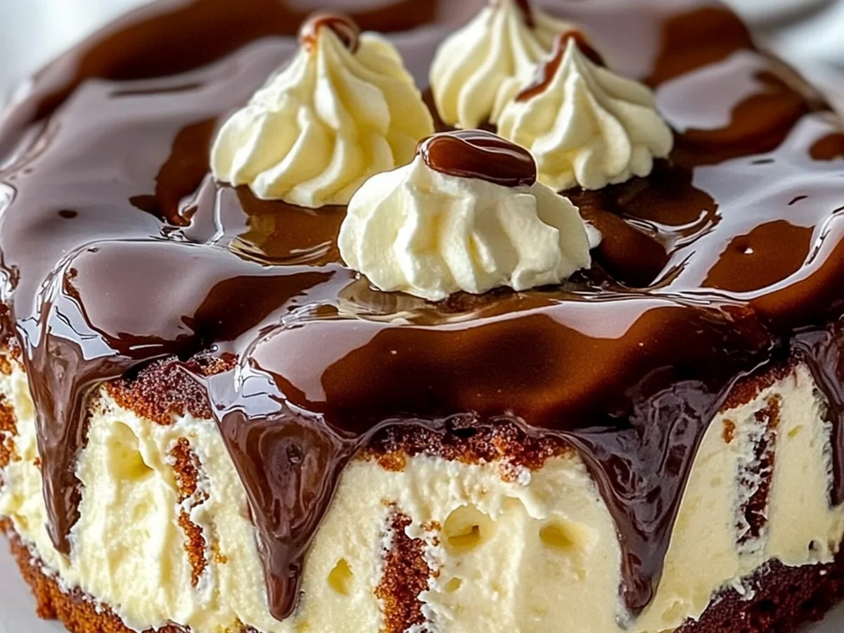 6. Top the Cake: Once the pudding has set and the ganache is slightly cooled but still pourable, pour the chocolate ganache over the top of the cake, spreading it evenly with a spatula. Allow the ganache to set for about 30 minutes before serving.