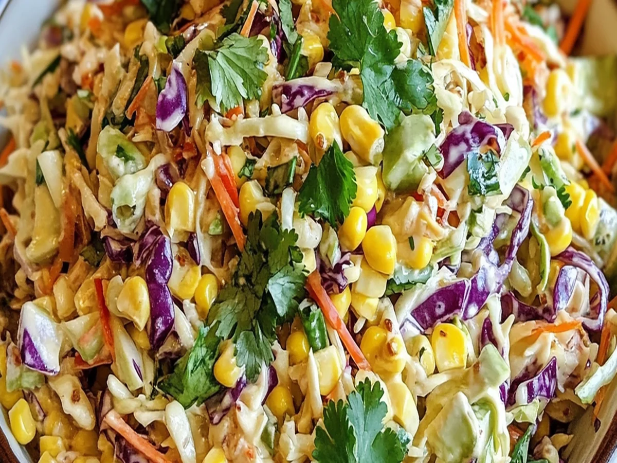 Texturally, the coleslaw is a feast for the senses: the crispness of the shredded cabbage provides a satisfying crunch, complemented by the juicy bursts of corn. Fresh cilantro adds an herbaceous brightness, rounding out the experience. The aroma is equally enticing, with the smoky scent of grilled corn mingling with the citrusy notes of lime, creating an inviting dish that beckons you to take a bite.