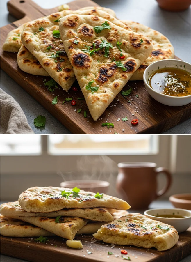 6. Servieren: Das Naan nach Belieben mit geschmolzener Butter oder Knoblauchbutter bestreichen und warm servieren.
