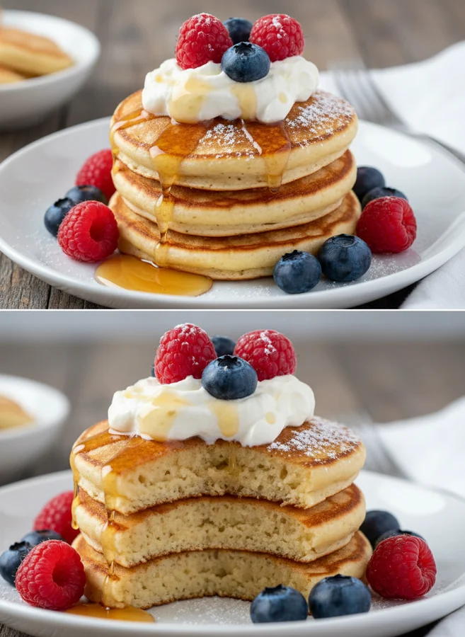 Ahornsirup oder Honig zwischen die Schichten träufeln und einen Klecks Schlagsahne oben drauf geben.