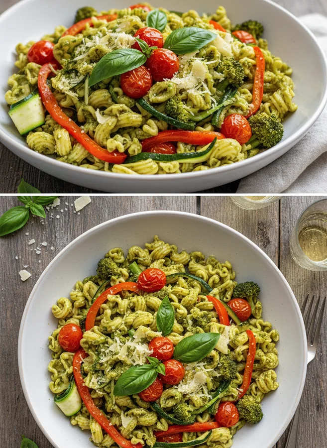Serviervorschläge für Pasta mit Gemüse und Pesto für ein schnelles Abendessen: