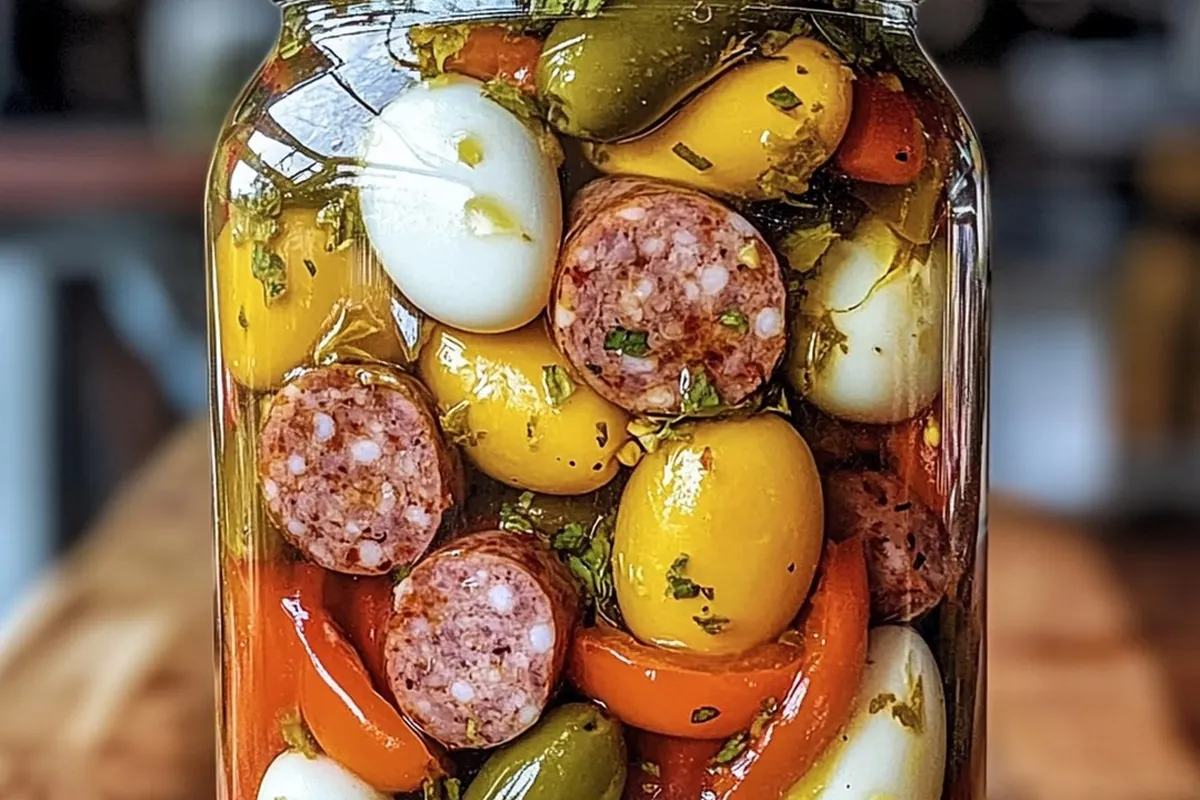 Pickled sausage, eggs, and peppers is a tasty dish. It mixes cured meats, brined eggs, and tangy peppers. This snack or breakfast item has spicy, tangy, and umami flavors.
