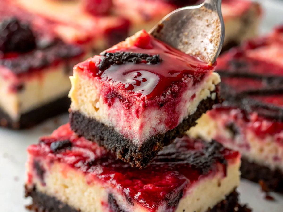 Raspberry Cheesecake Bars with Oreo Crust Ingredients: - 1 1/2 cups Oreo cookie crumbs - 1/4 cup melted butter - 16 oz cream cheese, softened - 1 cup sugar - 2 large eggs - 1 tsp vanilla extract - 1 cup sour cream - 1 cup fresh raspberries (or frozen, thawed) - 2 tbsp cornstarch - 1 tbsp lemon juice Directions: 1. Preheat your oven to 325°F (160°C). Line an 8x8 inch baking pan with parchment paper. 2. In a bowl, mix the Oreo cookie crumbs with melted butter until well combined. Press the mixture firmly into the bottom of the prepared baking pan to form the crust. 3. In a large mixing bowl, beat the softened cream cheese with sugar until smooth. 4. Add the eggs, one at a time, beating well after each addition. Mix in the vanilla extract and sour cream until fully combined. 5. In another bowl, mash the raspberries with a fork. Stir in the cornstarch and lemon juice. 6. Pour half of the cream cheese mixture over the crust in the baking pan. 7. Spoon dollops of the raspberry mixture over the cream cheese layer. Use a knife to swirl the raspberry into the cheesecake gently. 8. Pour the remaining cream cheese mixture on top and repeat the swirling with the remaining raspberry mixture. 9. Bake in the preheated oven for 40-45 minutes, or until the center is set but slightly jiggly. 10. Allow the cheesecake bars to cool completely at room temperature, then refrigerate for at least 4 hours or overnight before slicing. Your irresistible raspberry cheesecake bars are ready to enjoy!