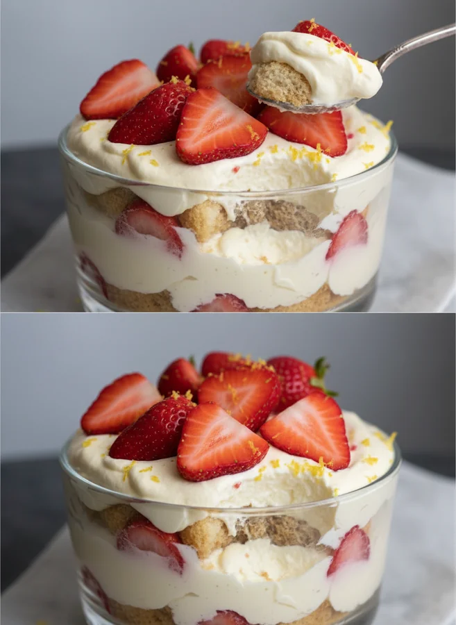 Eine Schicht Mascarpone-Creme über die Löffelbiskuits verteilen, dann eine Schicht Erdbeeren, und wiederholen bis alle Zutaten aufgebraucht sind.