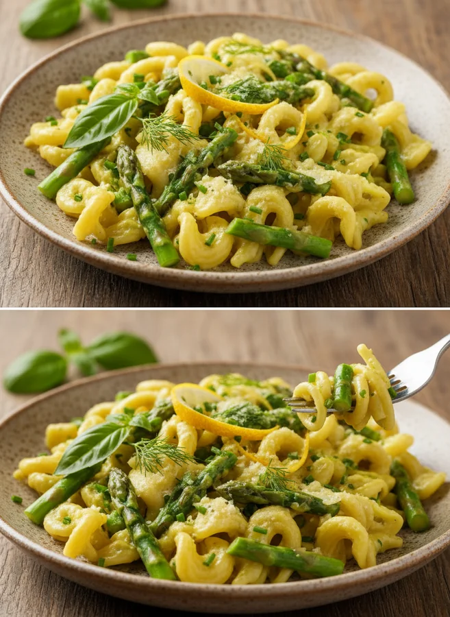 Vereinen Sie die gekochte Pasta, den Spargel und die Zitronensahnesauce in der Pfanne. Schwenken Sie alles, um es zu vermengen, und fügen Sie bei Bedarf das reservierte Nudelwasser hinzu.