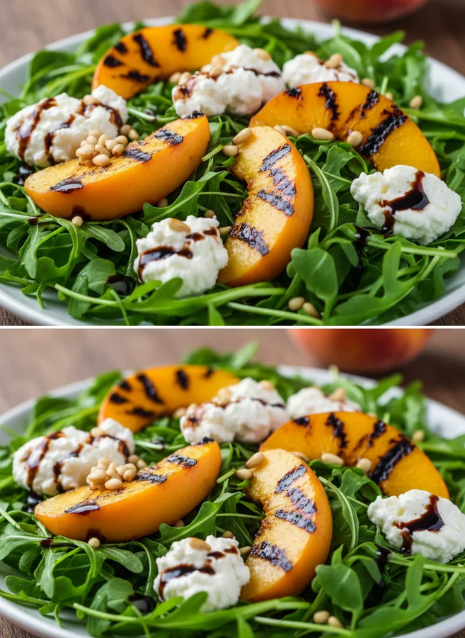 Fügen Sie die gegrillten Pfirsichspalten, Ziegenkäse und Nüsse zum Salat hinzu und würzen Sie mit Pfeffer und Salz.