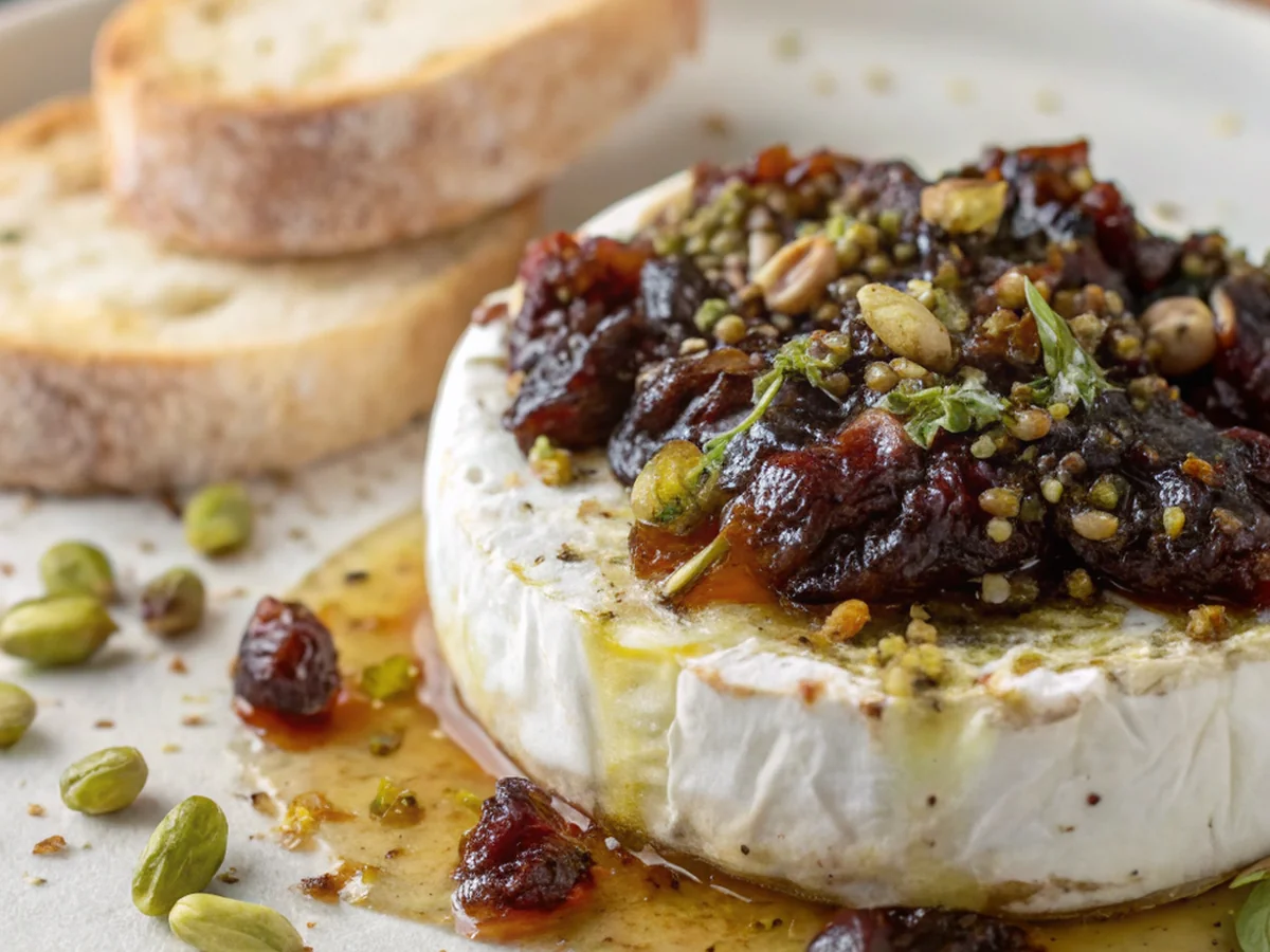 Serving Suggestions for Savory Baked Brie with Fig Jam, Pistachios, and Cardamom: