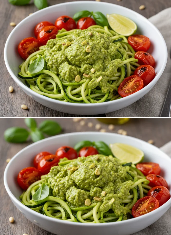 Zucchini-Nudeln sind nicht nur kalorienarm, sondern auch reich an Ballaststoffen, die die Verdauung fördern. Die Avocado im Pesto liefert gesunde Fette, die das Herz schützen und das Sättigungsgefühl steigern. Diese Kombination ist zudem eine hervorragende Quelle für Vitamine wie Vitamin C und E sowie Mineralstoffe wie Kalium und Magnesium. Durch den Verzicht auf herkömmliche Pasta kann das Gericht auch glutenfrei zubereitet werden, was es ideal für Menschen mit Glutenunverträglichkeiten macht. Mehr über die Vorteile einer gesunden Ernährung erfahren Sie in unserem Artikel über Ofen Gebackener Blumenkohl Einfach Und Lecker.