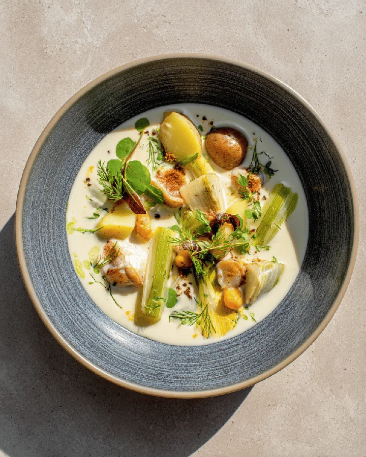 - Ingrédients principaux : Poireaux, pommes de terre, oignons, crème fraîche, bouillon de légumes, beurre, sel et poivre.