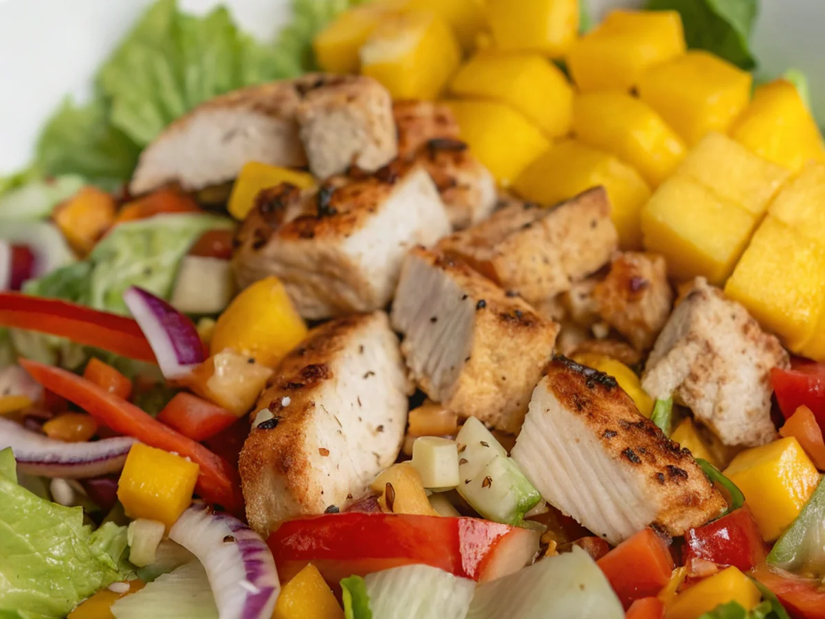 • Main ingredients: Chicken breast, ripe mango, mixed greens, red onion, jalapeño, lime juice, and cilantro.