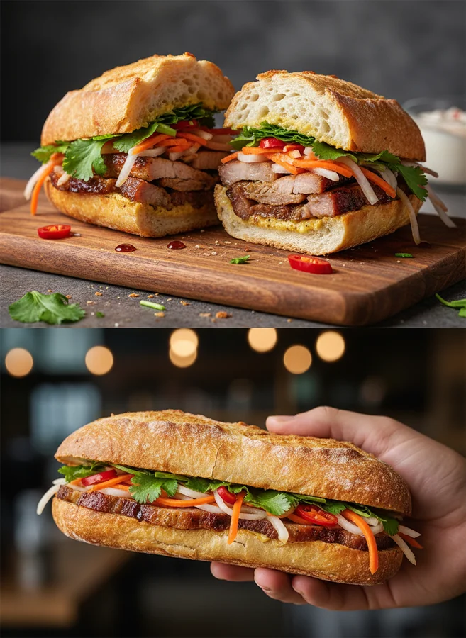 Baguettes halbieren, nach Belieben toasten. Mayonnaise verstreichen, Schweinefleisch schichten, eingelegtes Gemüse, Gurke, Koriander und Jalapeños hinzufügen. Schließen und mit Limettenspalten servieren.