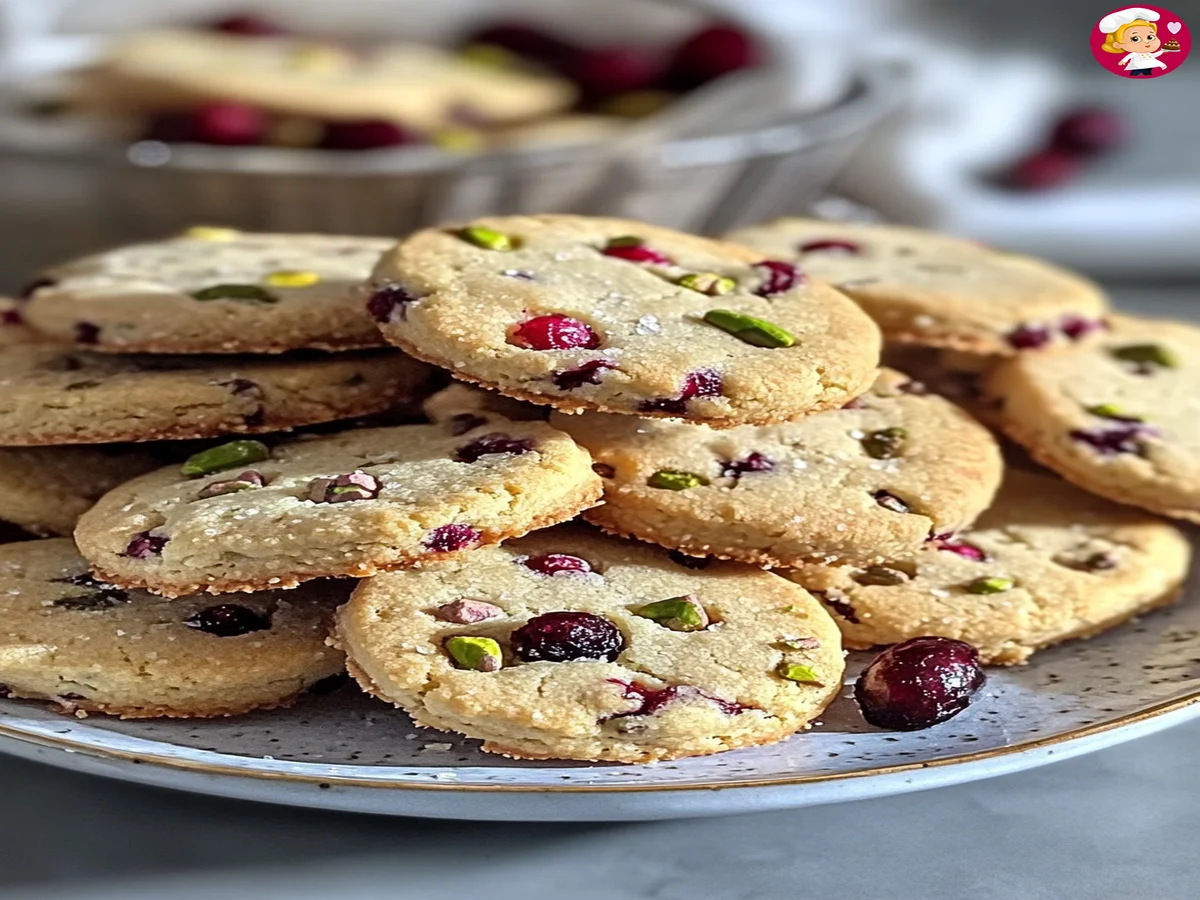 1. Start with a captivating introduction: Picture a buttery crumbly shortbread cookie, laden with bright red cranberries and green pistachios, both adding to the visual appeal and giving each bite