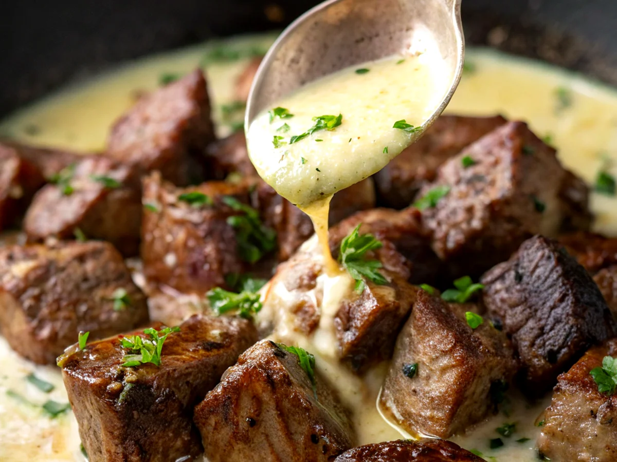 5. Combine and Serve: Return the seared steak bites to the skillet, stirring gently to coat them in the creamy sauce. Cook for an additional minute to heat through. Garnish with freshly chopped parsley if desired.