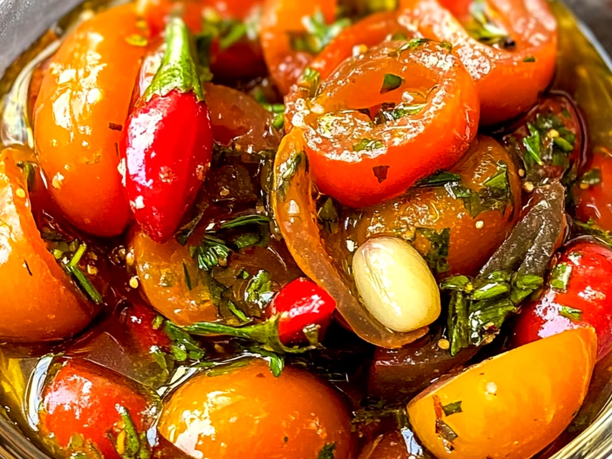 - Ingrédients principaux: Tomates cerises, huile d’olive, ail, herbes méditerranéennes (thym, origan, basilic), sel et poivre.
