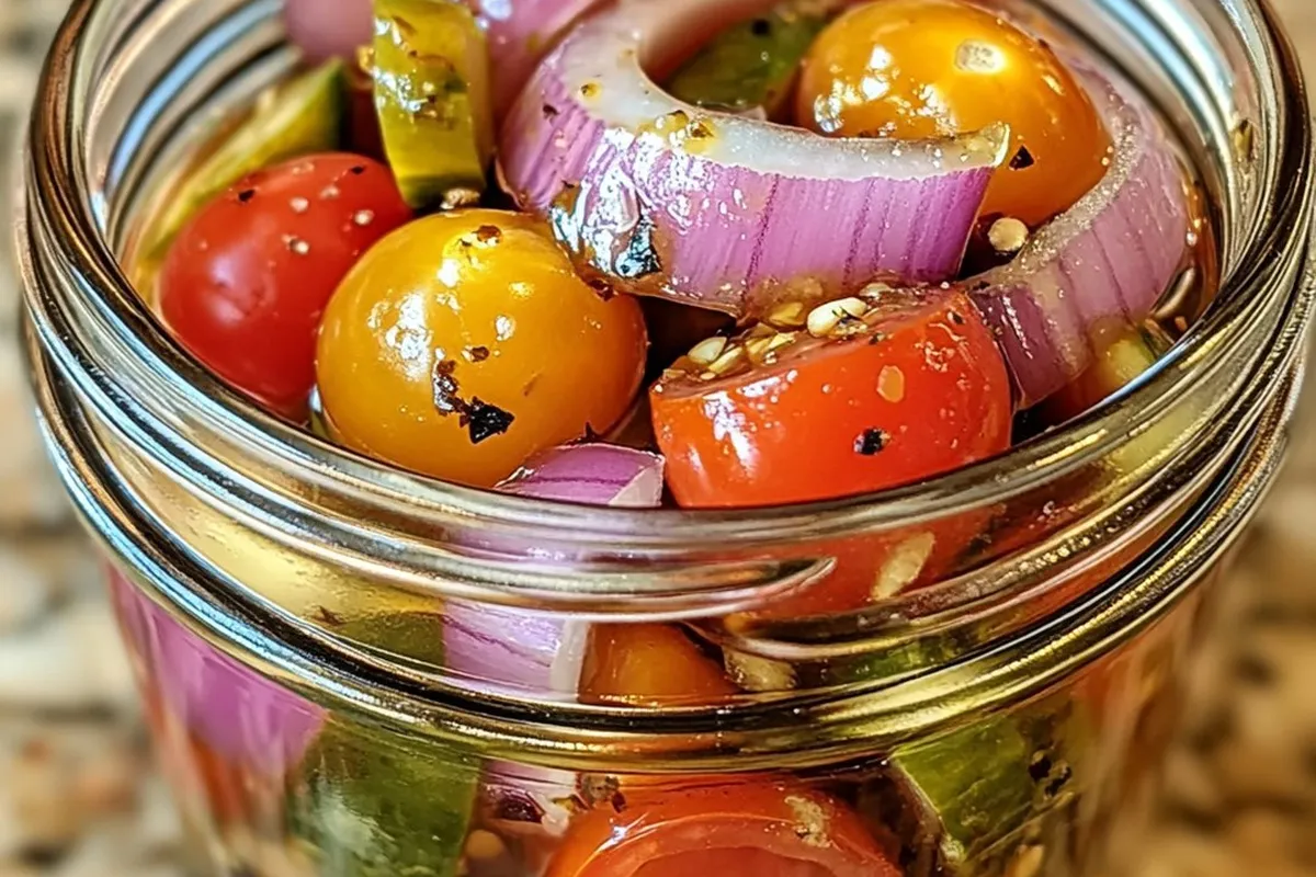Discover the vibrant delight of pickled cherry tomatoes, red onions, and cucumbers. This perfect side dish brightens up any summer gathering. It’s quick, easy, and brings the ideal balance of sweet and tangy flavors.